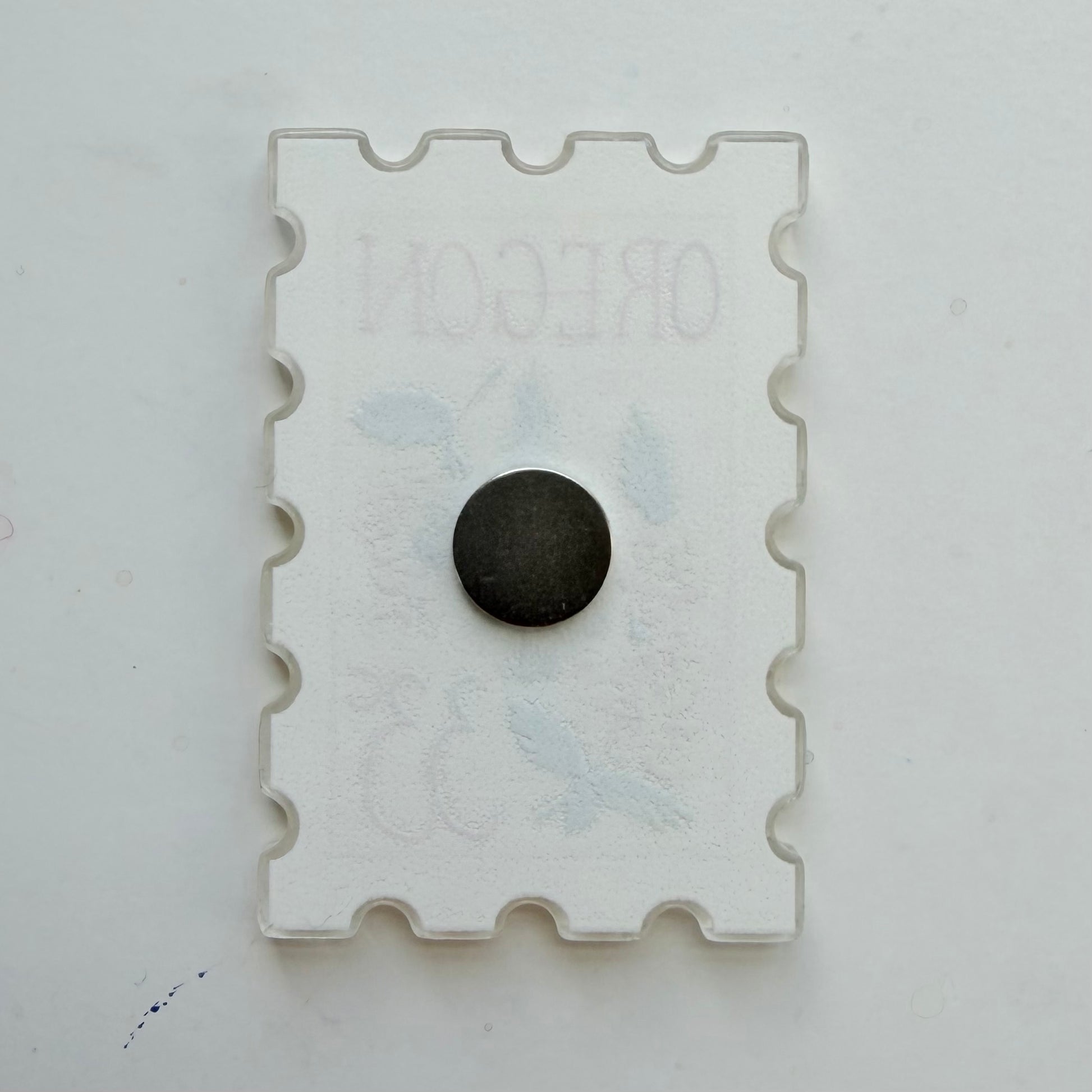 State stamp design is printed on acrylic with a high quality circular magnet affixed to the back.