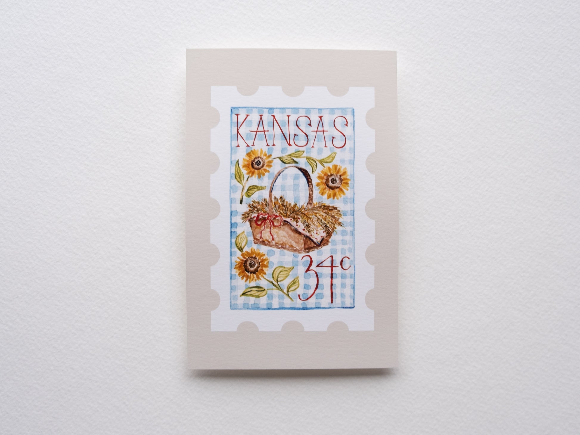 Due to the printing process, the beige background and stamp colors may vary between prints.