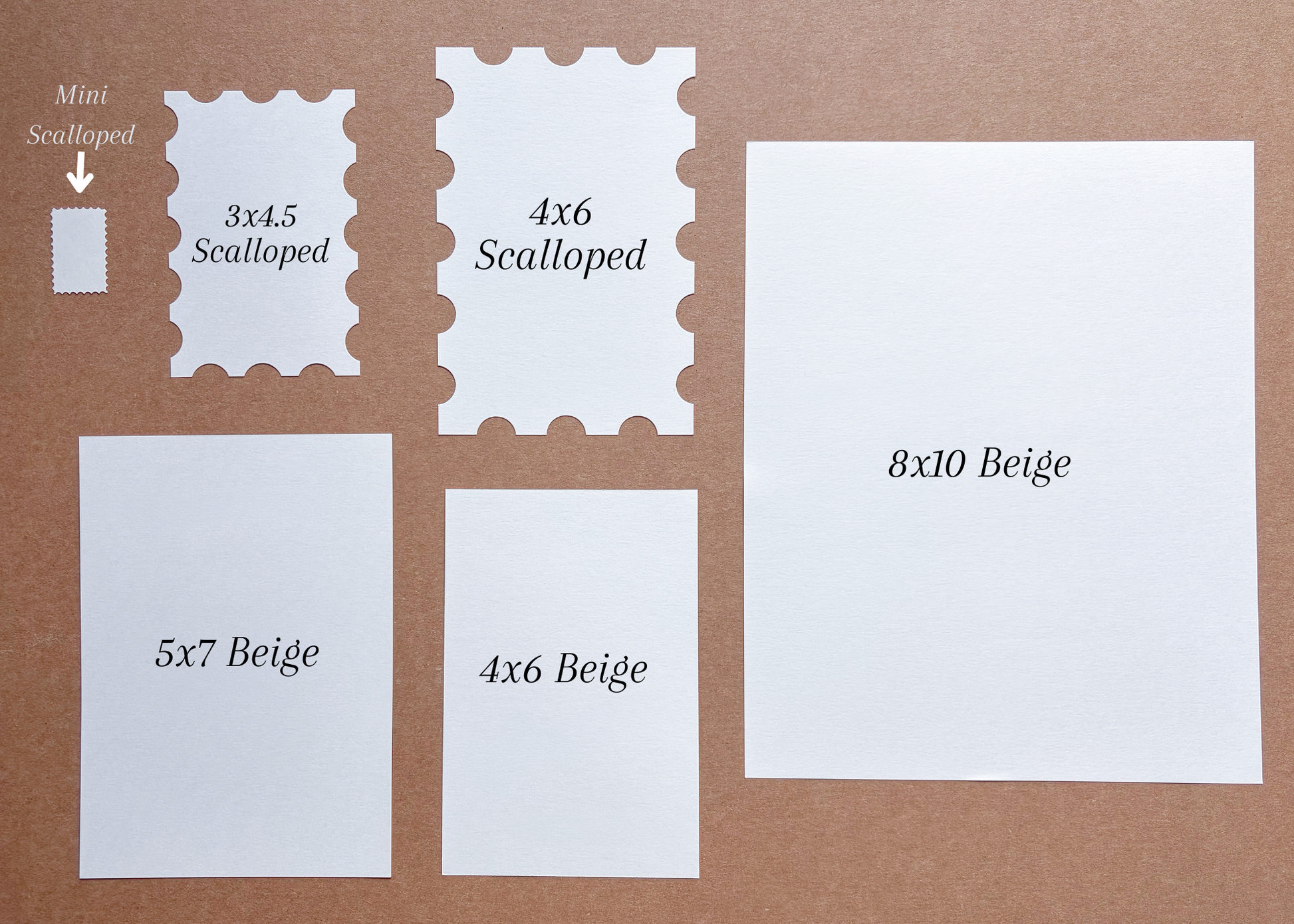 • 4x6, 5x7, or 8x10 inch prints with a beige background. Photos show the 4x6 version of the beige background. Larger sizes will have the same design, though the cropping may vary slightly to fit the proportions of each size.